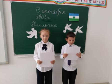 13 октября в нашей школе прошли мероприятия, посвященные Дню памяти сотрудников правоохранительных органов, погибших при исполнении служебного долга. В этом году мы отмечаем 20-летие разгрома бандформирований в республике Кабардино-Балкария. Мы провели уроки мужества и митинг, на котором почтили память героя, старшего лейтенанта полиции Балкарова.А.А, отдавшего свою жизнь за безопасность нашей страны. В знак уважения мы возложили цветы к памятнику, вспоминая его подвиг и самоотверженность. Давайте будем помнить о тех, кто защищает наш покой!