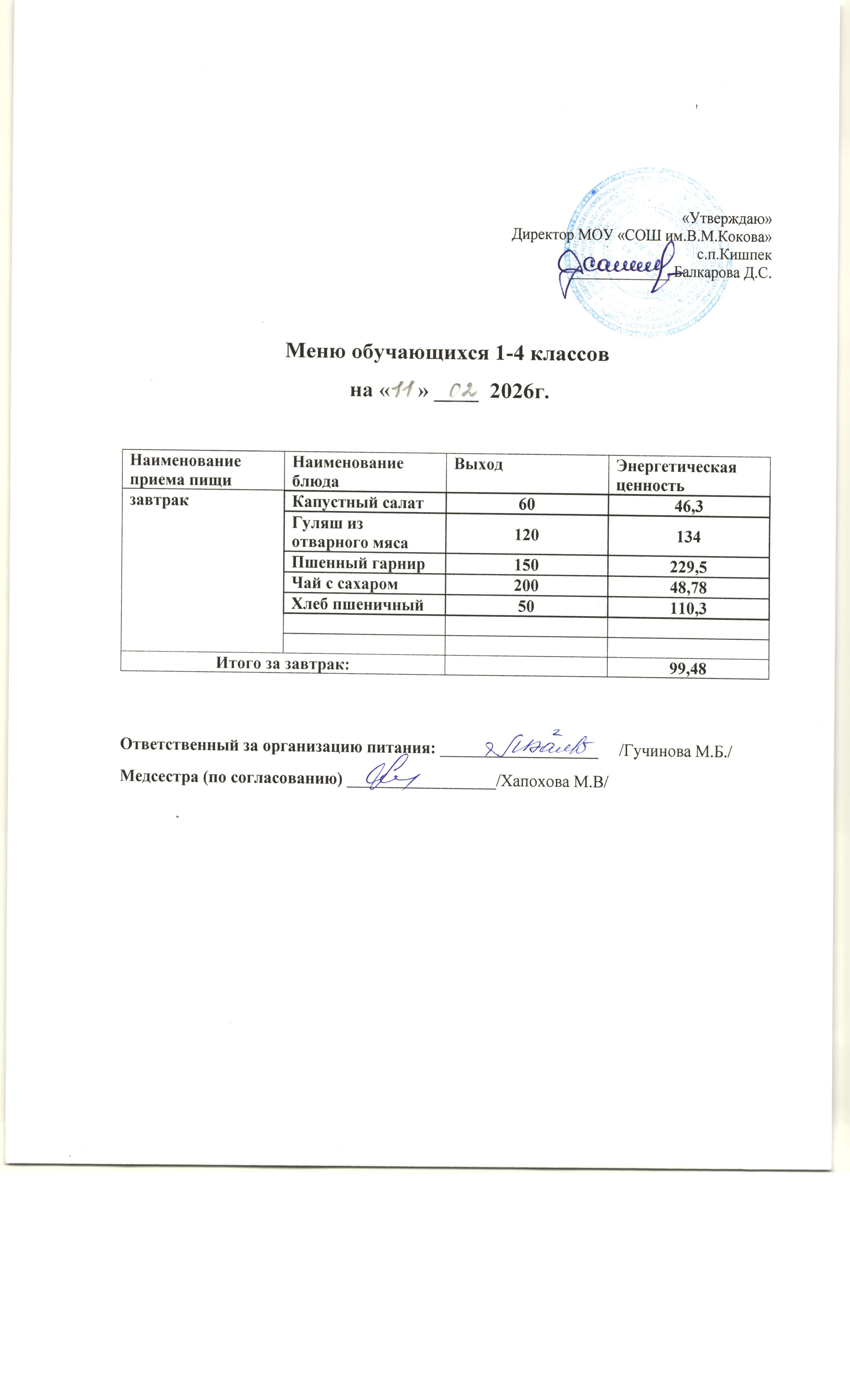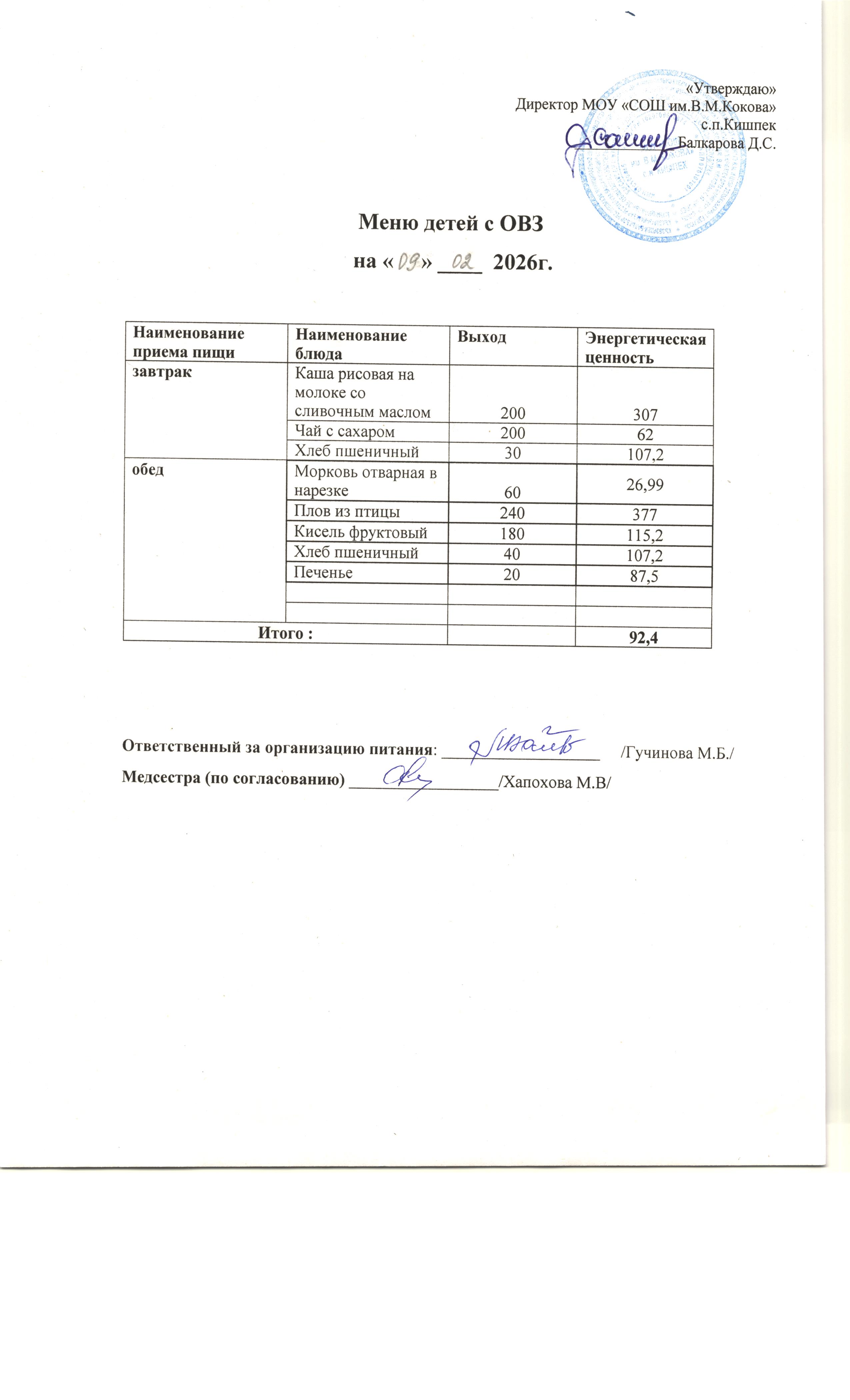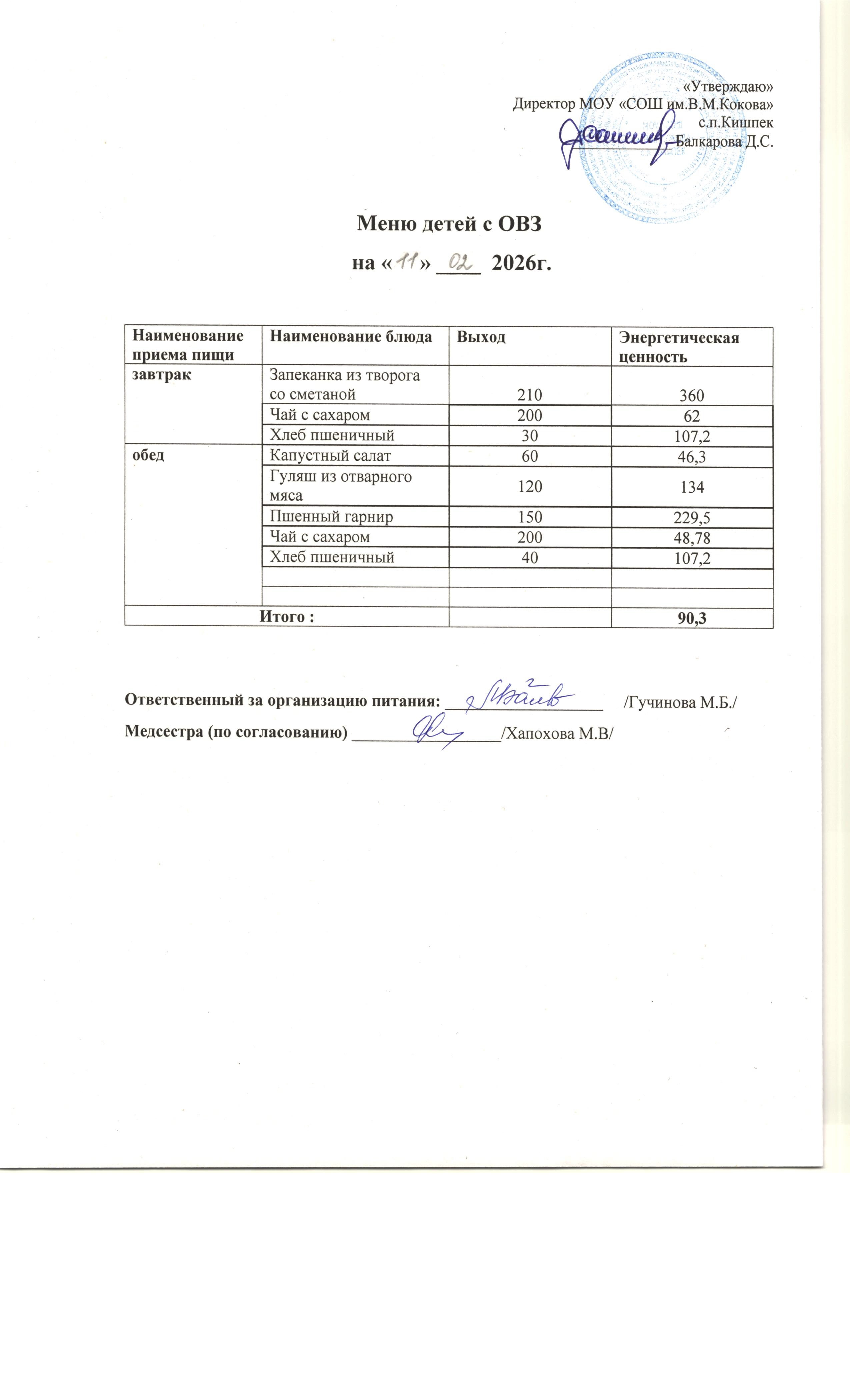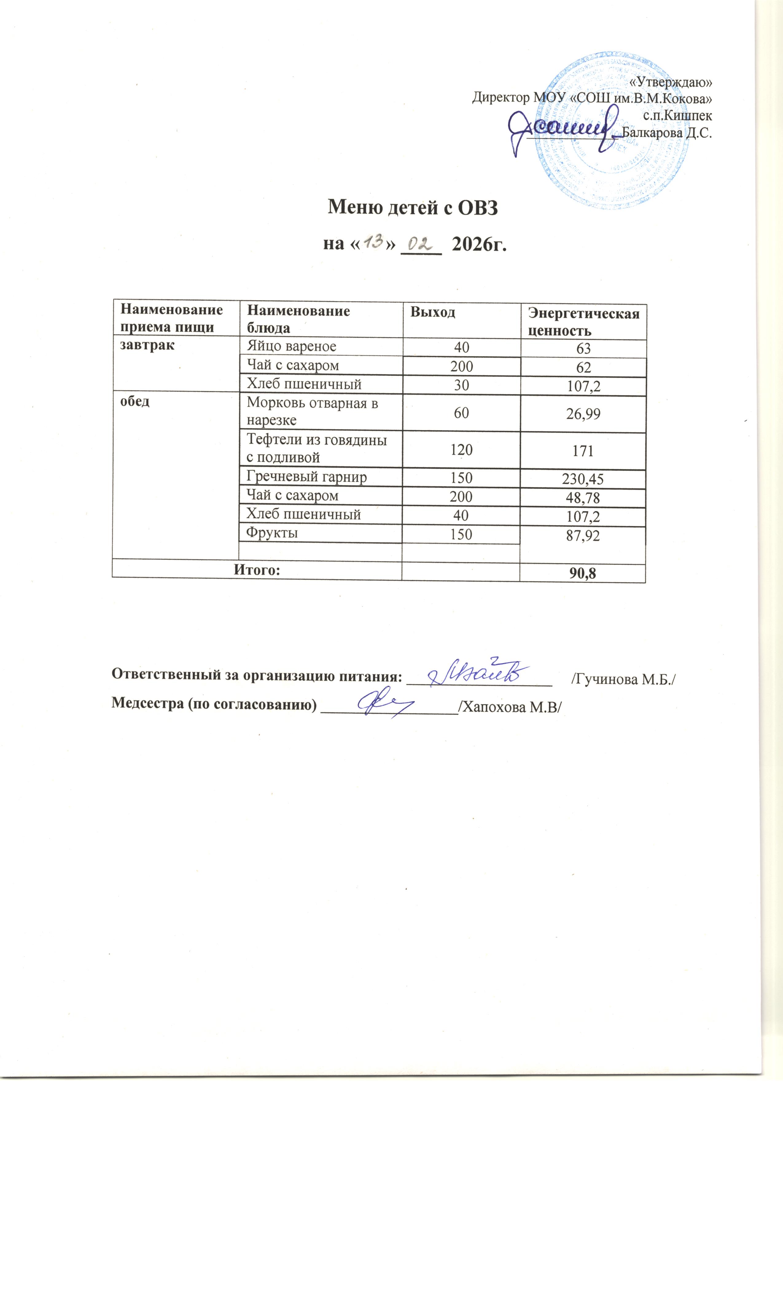 об условиях питания и охраны здоровья обучающихся в МОУ "СОШ им.В.М.Кокова" с.п.Кишпек